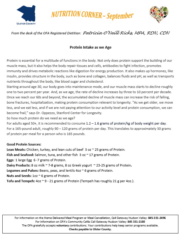 Nutritional education is provided with a monthly menu to meal program participants and at the Community Cafés throughout the county six times/year. Nutritional counseling is provided free to Seniors either in their home or on site by a registered dietician. Contact 845-340-3456 for further information.